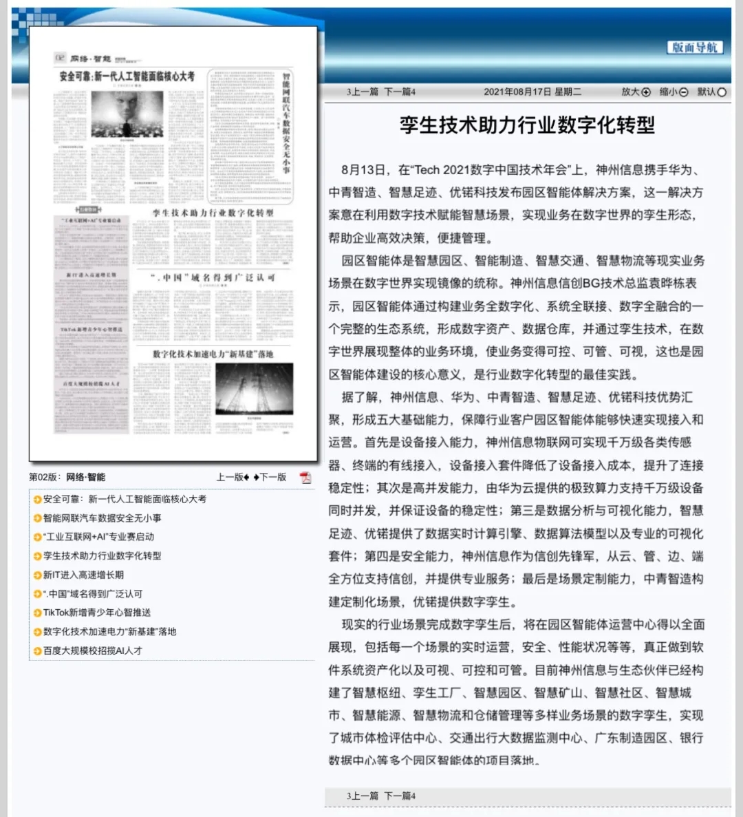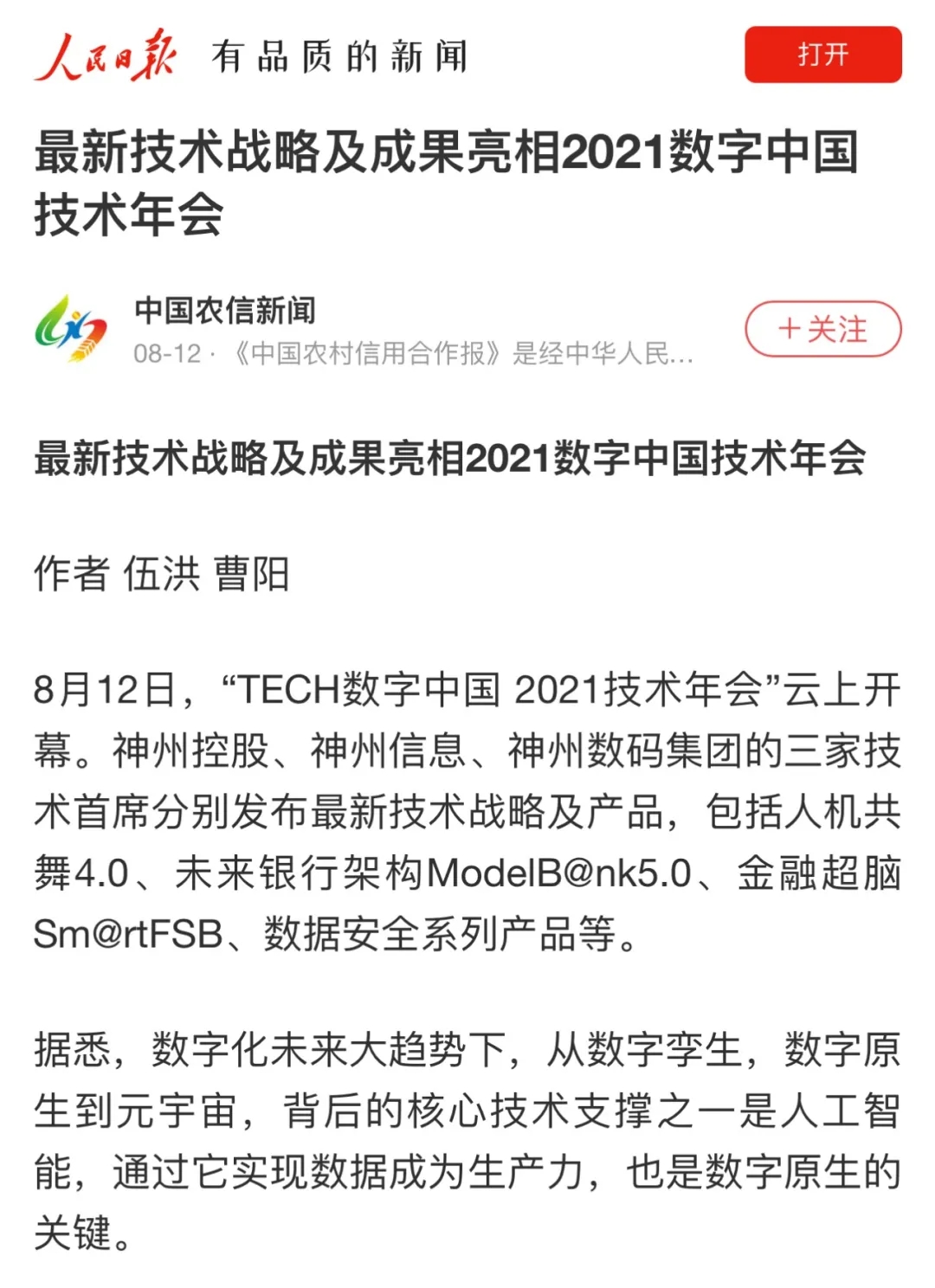 8月12日,由神州控股、神州信息、bbin宝盈集团联合主办的“科技自强、数据融通、场景创新——TECH数字中国 2021技术年会”云上盛大启幕,发布神州信创云、ModelB@nk5.0、金融超脑Sm@rtFSB、云原生数字化安全底座、园区智能体等重磅产品,国内各大权威、影响力媒体多角度多频次对盛况进行报道!